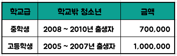 지원금액은 학교급과 출생 연도에 따라 다르며, 고등학생 및 고등학생에 준하는 학교 밖 청소년(2005년 ~2007년 출생자)은 최대 1,000,000원을 지원받을 수 있고 중학생 및 중학생에 준하는 학교 밖 청소년(2008년~2010년 출생자)은 최대 700,000원을 지원받으실 수 있습니다.