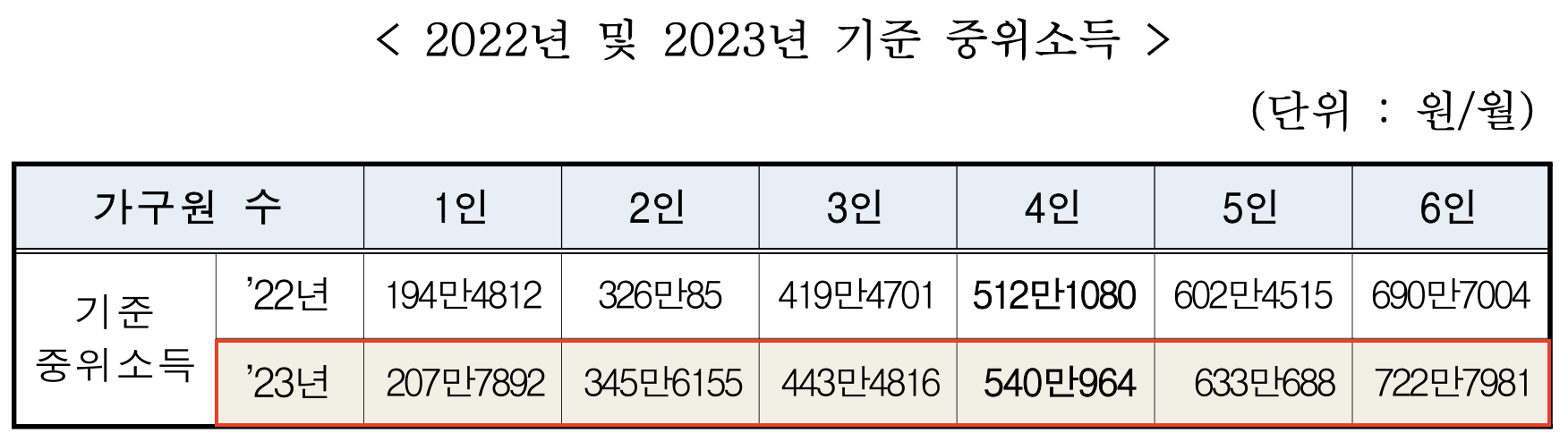 이 부분을 반드시 짚고 넘어가야 하는 이유는 바로 우리가 혜택을 받기 위한 지원 자격의 기준이 되는 소득 금액이기 때문입니다. 위의 표에서 1인 가구를 기준으로 대략 월 2,077,900원을 번다면, 1인 가구의 벌이가 대한민국에서 중간은 간다는 뜻입니다.