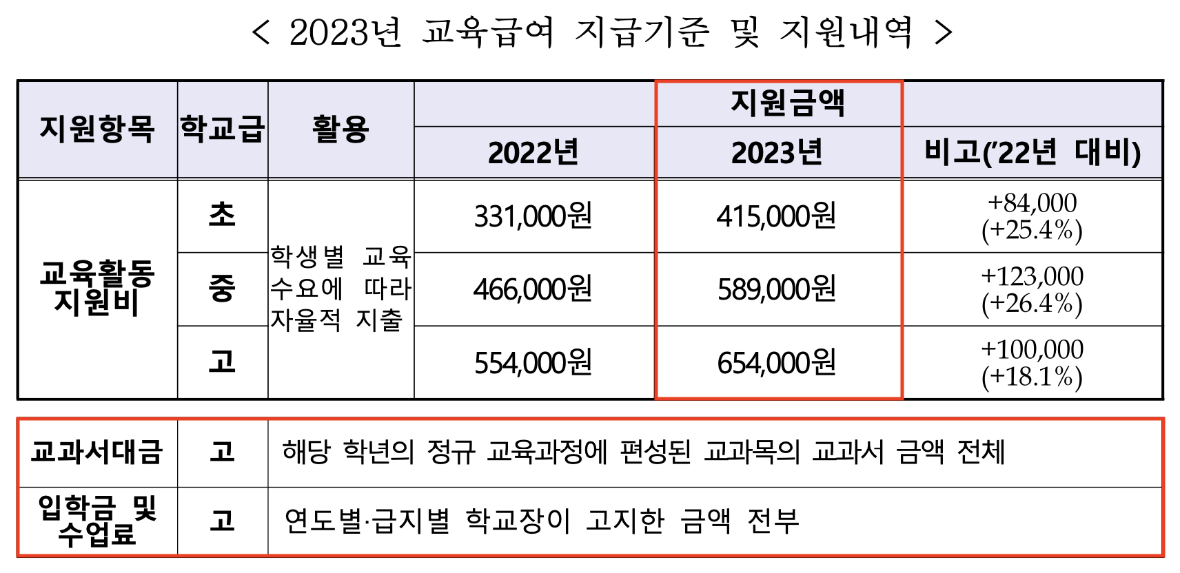 지원금액은 2022년 대비 약 18~26% 인상되었으며, 고등학생의 경우 추가로 해당 학년의 정규 교육과정에 편성된 교과목의 교과서 대금 전체와 연도별, 급지별 고지된 입학금 및 수업료 전액을 지원받을 수 있습니다. 특히, 고등학생 자녀를 둔 학부모님 또는 보호자의 가계 부담을 줄일 수 있는 지원이니 해당하시는지 확인하시고 꼭 혜택을 누리시길 바랍니다.